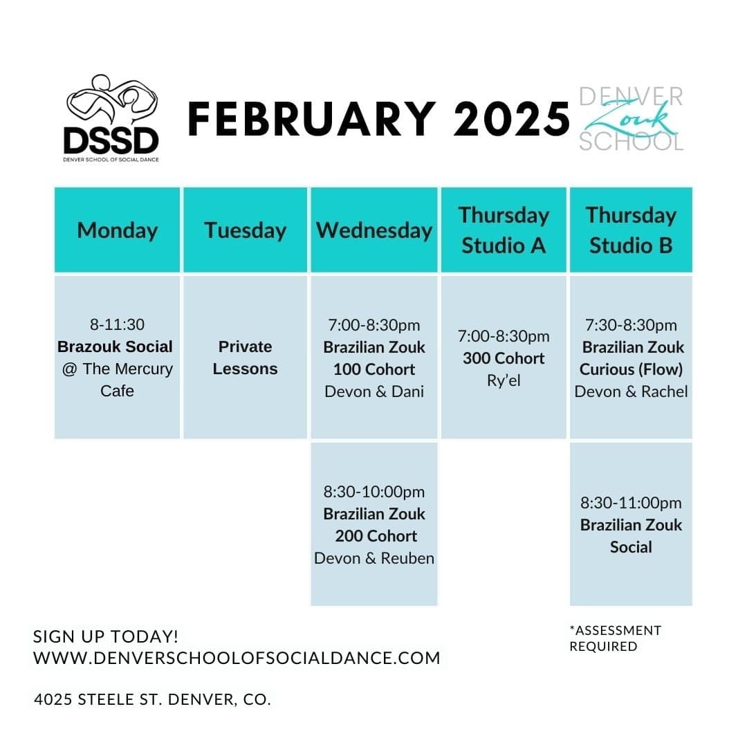 Our schedule changes monthly, be on the lookout for updates and follow @denverschoolofsocialdance on instagram for daily updates.